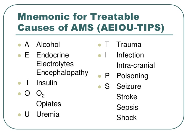 Discussion: The initial dilemma in this case lies in the fact that the patient had a concerning episode at home and then arrives asymptomatic with a normal exam. Faculty and fellows were somewhat split on discharging versus initiating a work up (most would start with head imaging). Dr. Rucker’s mnemonic of TIPS AEIOU (see below) is helpful in cases like this one to remind us of our ‘can’t miss’ diagnoses and decide if a work up is warranted.